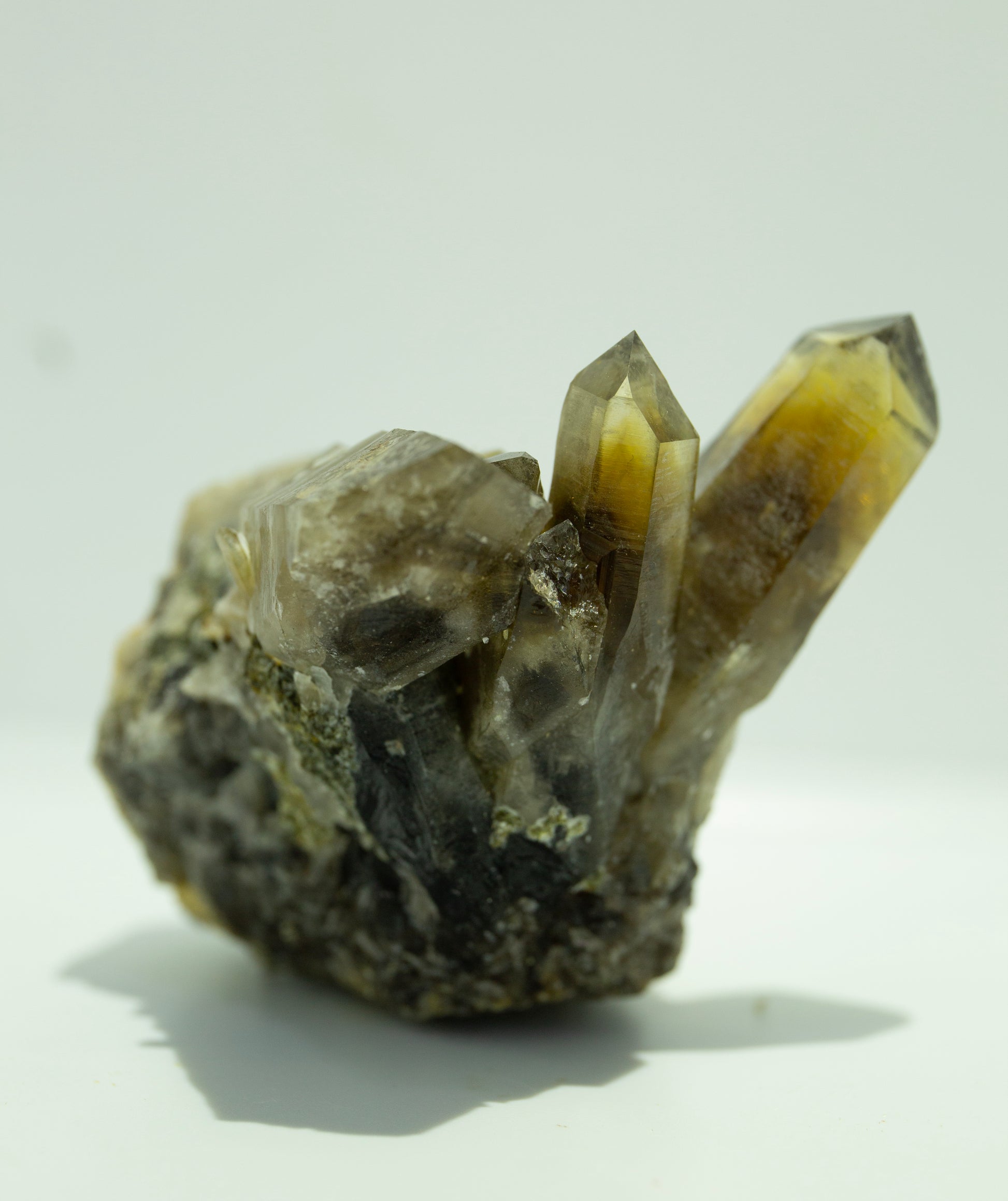 natural citrine crystal cluster with dark colour grading from smoky to dark orange. Quartz + mica matrix. Clean terminations with record keeper and strong phantoms.