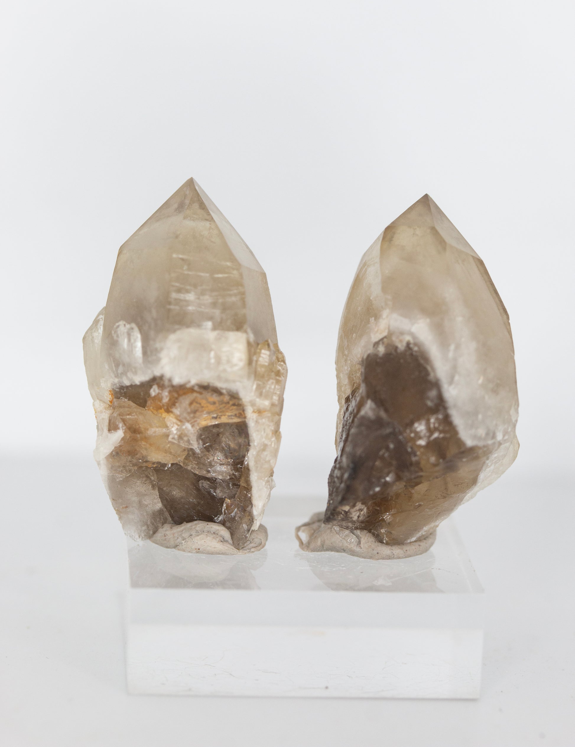 Overgrowth quartz crystal pair.dark core with golden smoky citrine top. Smaller crystals skirting main point. Attractive pieces